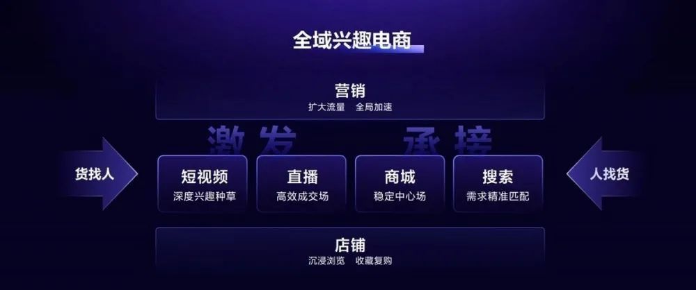 首先,抖音电商此前的发力点主要在内容领域,即在短视频和直播场景中售卖,这是原“兴趣电商”模式,就是向潜在消费者推荐其可能感兴趣的商品或带货直播。后升级为“全域兴趣电商”,集合了短视频、直播、商城、搜索、店铺等多元化场景,加强自身的电商资源。