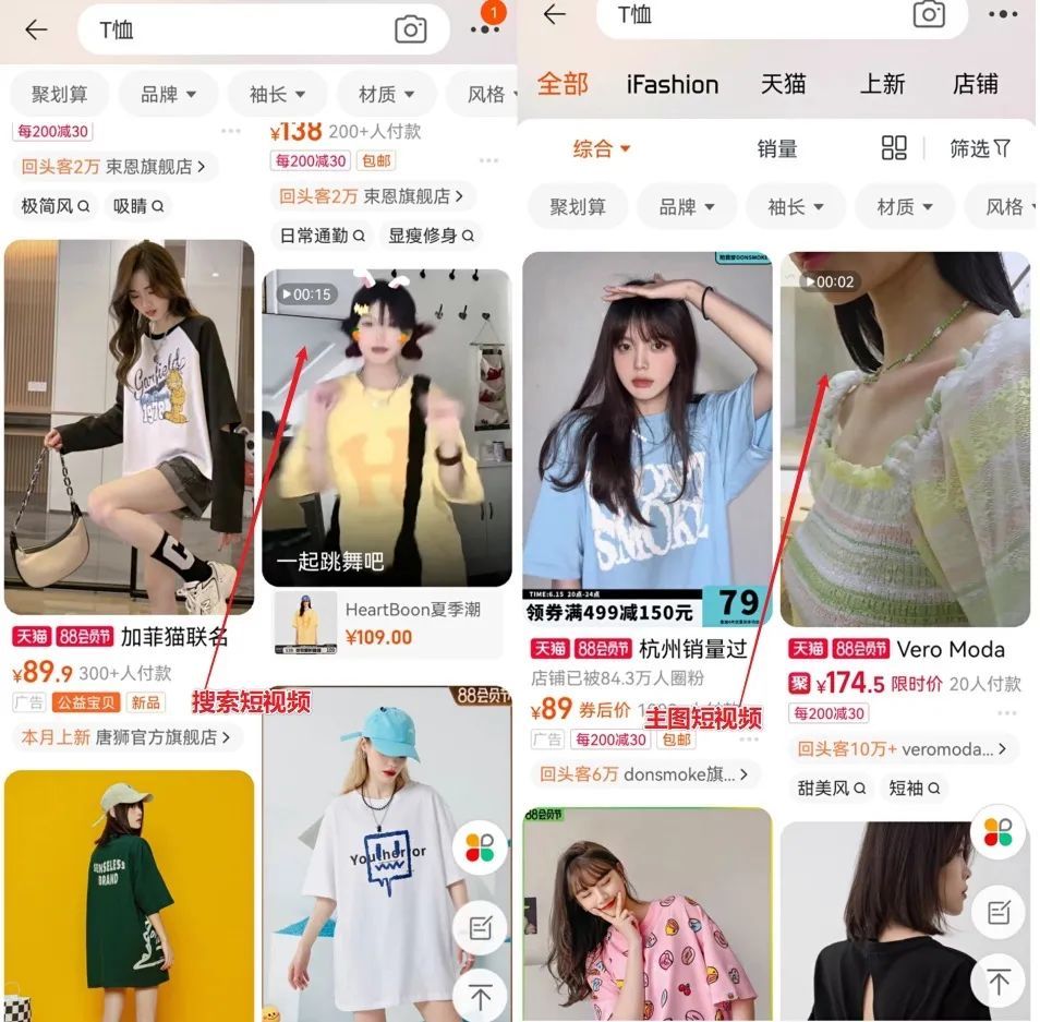 如今,在手淘搜索关键词“T恤”,你可能会刷到一个跳舞的姑娘——某家旗舰店发布的“一起跳舞吧”短视频。也可能刷到“精致女孩如何风格多变”等为主题的短视频内容。
