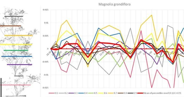 在兹林斯基的研究中,一棵广玉兰的不同部位直径随着时间变化的情况(图片来源:András Zlinszky, Twitter)