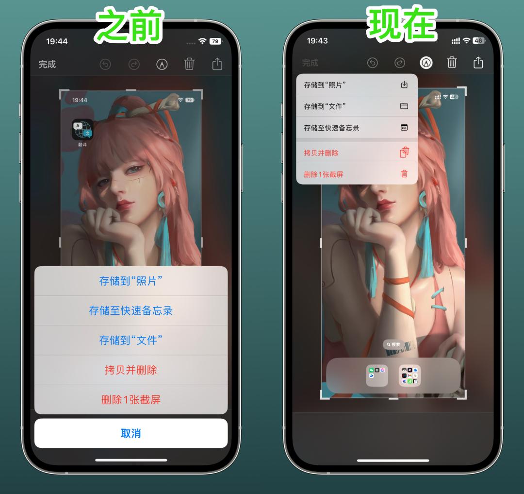 截图页面点击「 完成 」后的选项是在下方,现在改为左上角,离「 完成 」更近,操作起来更顺手了。