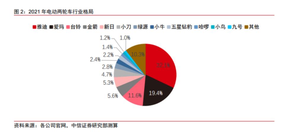 雅迪作为行业龙头,一骑绝尘。2021年销量达1390万辆,爱玛紧随其后,实现847万销量,两大品牌的市场占有率已达45%。