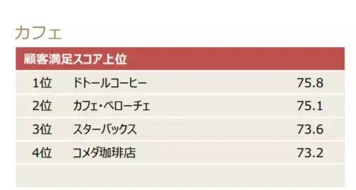 2019年日本JSCI顾客满足度排名,第一名:DOUTOR,第二名:CAFFÈ veloce,第三名:星巴克,第四名:Komeda咖啡店