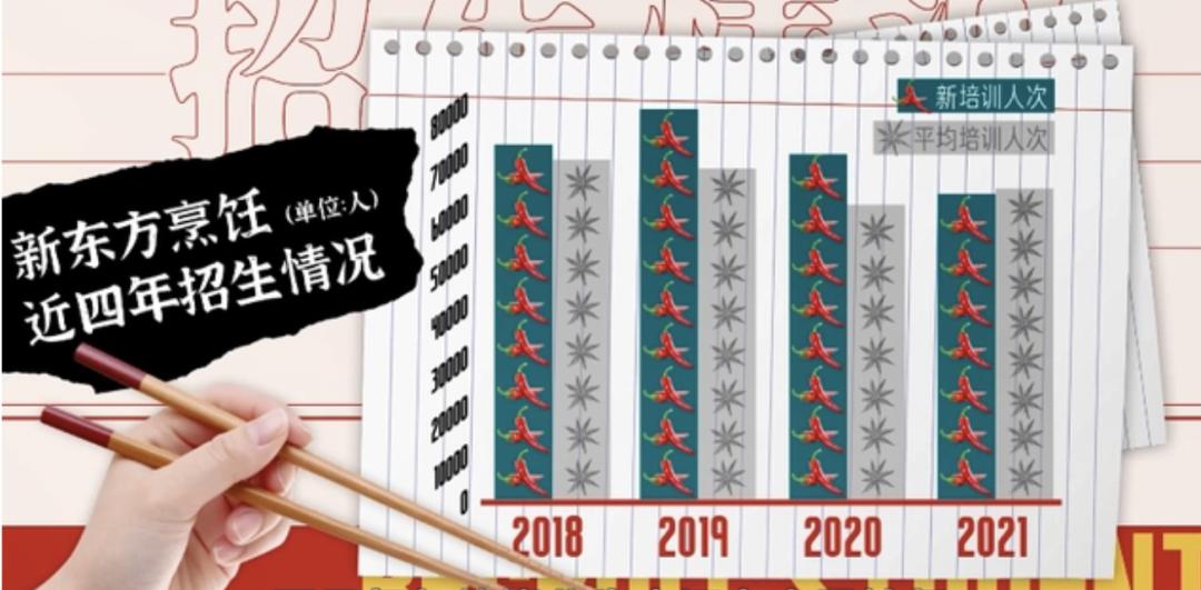 但就是这么大的缺口下,当年火爆电视的新东方烹饪教育,却招不到学员。培训人次逐年递减,每年的毕业生中还有大量转行。