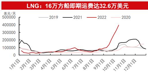 在此背景下,全球LNG船的租金快速上涨。截至10月14日,16万方的LNG船现货市场运费达39.62万美元,月环比上涨了21%。