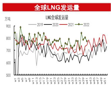 从运输成本来看:天然气的主要运输方式有两种,一个是管道运输,另一个是航运输送。由于目前俄乌关系紧张,北溪线路受到破坏,目前欧洲地区的天然气主要依靠航运来供应。可以看到,目前全球LNG航运市场异常火爆,发运量明显高于近三年的平均水平。