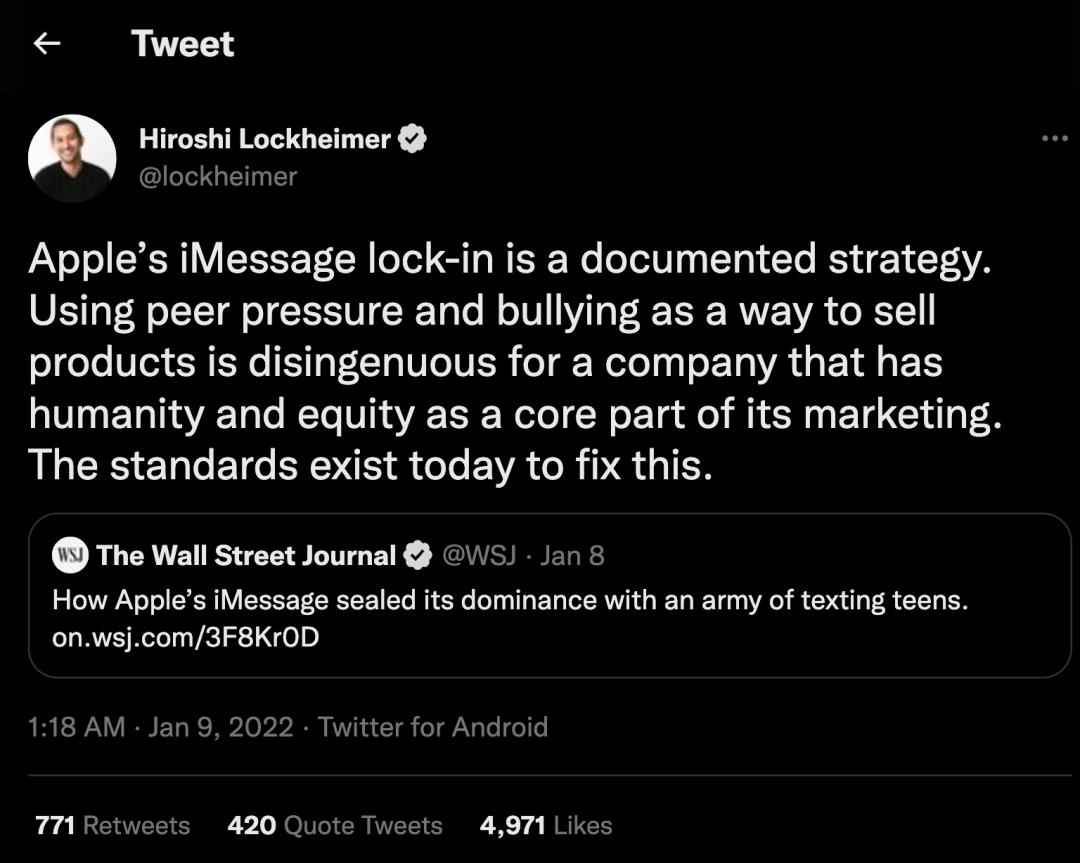 今年一月,Google 高级副总裁 Hiroshi Lockheimer 在转发华尔街日报关于 iMessage 的报道时,曾表示苹果正在利用 iMessage 造成的社交压力,作为其营销的一部分;随后 Google 官方转发了这一言论,并最终演变成在官网中呼吁(观感上来讲更像是指责)苹果开放自家生态,加入更为通用的 RCS 短信生态,来让更多 Android 用户获得更加平等的沟通环境,消解掉不少用户从 iPhone 更换到 Android 手机时遇到的重要阻碍。