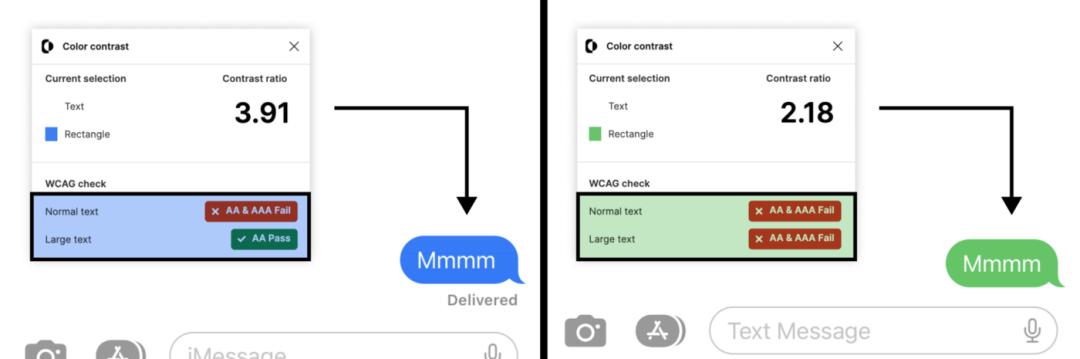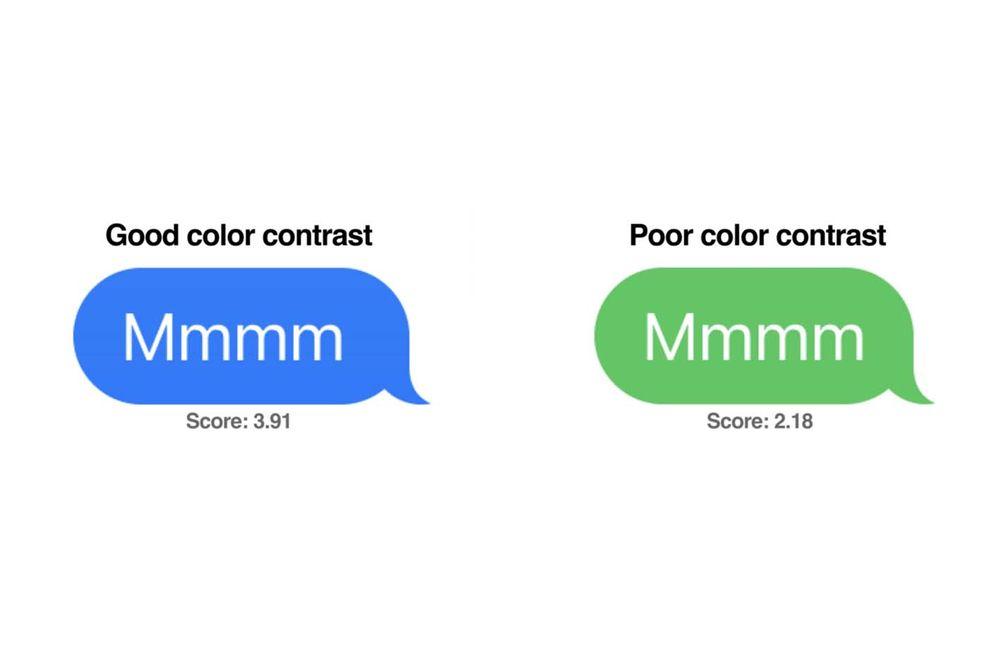 出于好奇,作者自己也使用在设计中至关重要的的网页无障碍设计指南中所提供的可访问性测试中,分别为这两种不同对比度的气泡颜色做了测试:在测试中,采用低对比度绿色的界面的分数也只是代表「非常差」的 2.18 分。