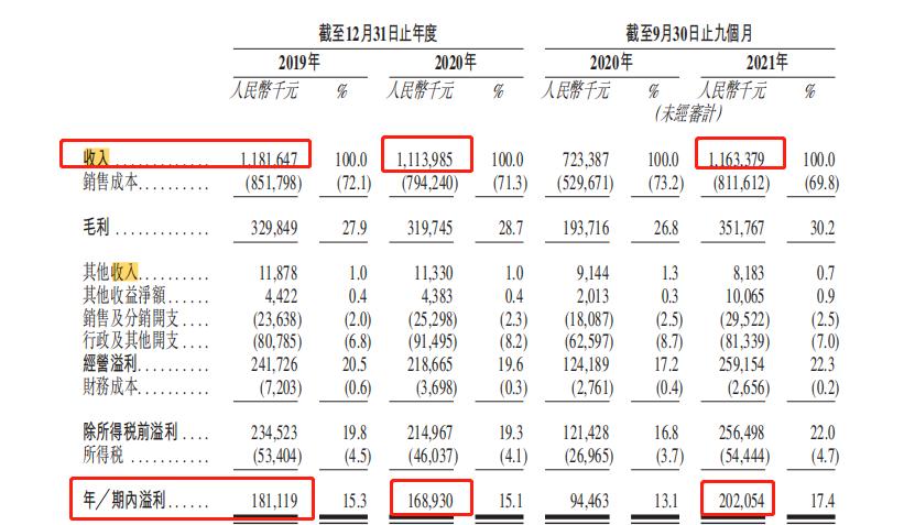 招股书显示,2019年、2020年、2021年前9个月,杨国福麻辣烫营收分别是11.82亿元、11.14亿元、11.63亿元;实现利润分别为1.81亿元、1.69亿元、2.02亿元。