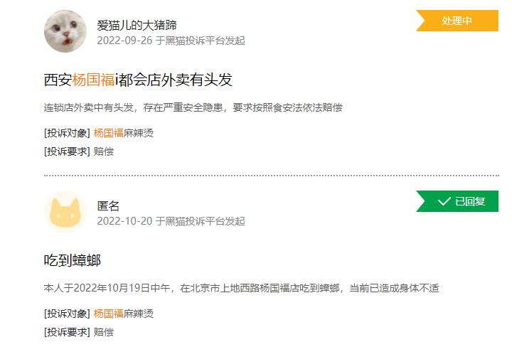 新浪黑猫投诉平台上,有关杨国福的投诉有780多条,大量的问题指向食品安全,比如骨肉相连变质、菜里有虫子、外卖中有头发、吃到蟑螂、吃出苍蝇等等。