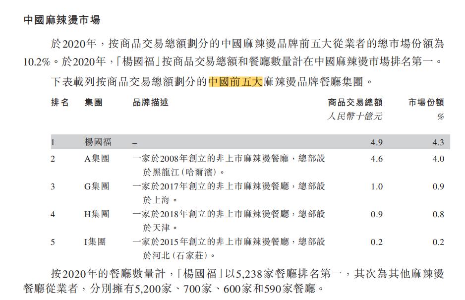 根据此前招股书,2020年的麻辣烫市场,杨国福商品交易额排行第一,金额是49亿元,市场份额4.3%。餐厅数量5238家,也排行全国第一。截至2021年9月30日,杨国福麻辣烫门店总数5783家。
