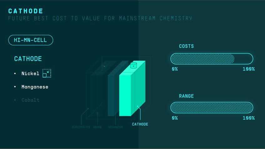 下图中大众给出的预计是在成本相对较低的情况下,要实现与三元相当甚至更高于三元的续航里程,据此推测具体材料体系不大可能为磷酸锰铁锂,更有可能是高压富锂锰基材料或者尖晶石镍锰酸锂材料。
