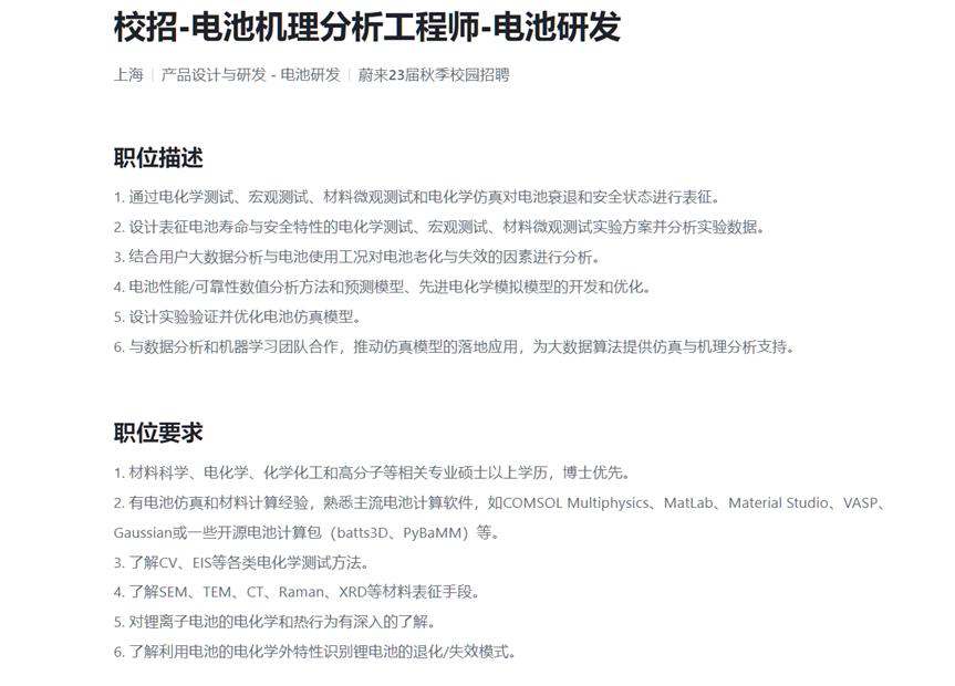 国内造车新势力如蔚来也在寻求电芯研发高端人才。从今年校园招聘博士专场信息来看,蔚来招聘岗位包括电化学仿真、电池机理分析、硅基方向负极、石墨负极、锂金属负极、高分子电极材料等研发方向。