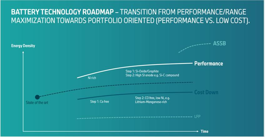 高性能路线上,宝马倾向正极上采用富镍技术,负极首先是硅的氧化物与石墨掺杂的负极,之后会实现更高硅含量的硅基负极,比如使用Si-C复合材料提升电池能量密度。