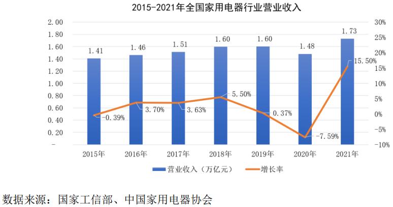 根据工信部及中国家用电器协会统计数据显示,2021年度全国家用电器行业营业收入1.73万亿元,同比增长15.5%。2020年新冠疫情爆发并在全球范围内蔓延,全球家电产能均受到不同程度影响,受益于国内对疫情的有效控制及健全的产业链,外销订单需求显著增加,2021年度家用电器行业销售收入大幅增长。