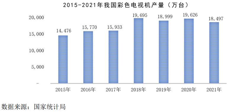 电视机行业方面,根据国家统计局数据显示,我国电视机年产量由2015年的 14475.73万台增长至2021年的18496.5万台,年复合增长率为4.17%;2021年我国彩电市场零售规模达1289亿元,同比增长6.6%。未来,我国电视机产业仍将保持稳步发展态势。