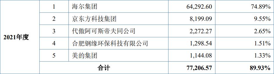 随着智能家电产业的快速发展,公司也实现了快速发展。2021年公司前五大客户分别是海尔集团、京东方科技集团、代傲阿可斯帝夫同公司、合肥钢缘环保科技有限公司、美的集团。
