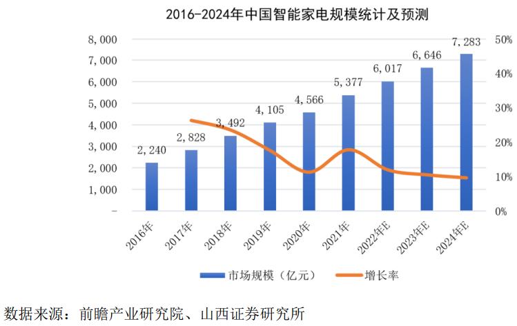 另外根据前瞻产业研究院数据显示,2020年我国智能家电的市场零售额达到 4566亿元,预计到2024年,中国智能家电市场规模将突破7000亿元,市场规模和发展空间广阔。