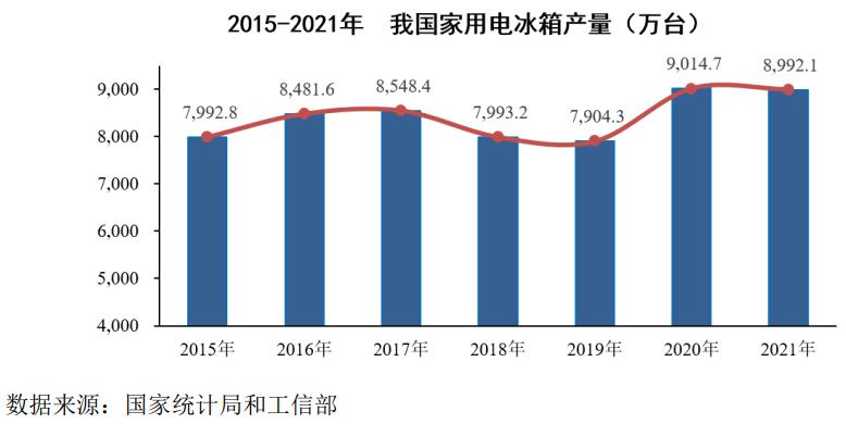 冰箱行业方面,根据国家统计局数据显示,我国冰箱产量从2015年的7992.8万台增长至2021年的8992.1万台,年复合增长率1.98%;2021年我国冰箱市场零售额达971亿元,同比增长7.89%。
