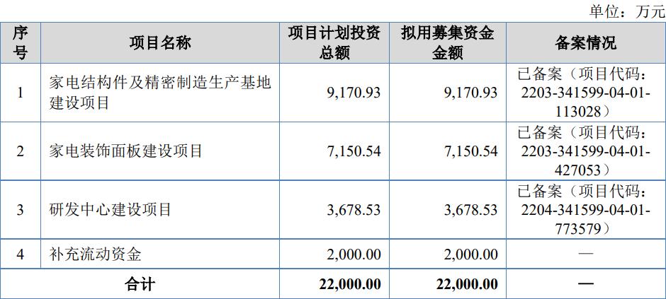 IPO募资方面,本次公司拟募资2.2亿元,资金将用于家电结构件及精密制造生产基地建设项目、家电装饰面板建设项目、研发中心建设项目等。项目建成投产后,将进一步提升公司的产能,更好的抓住市场机遇,巩固和提高行业地位和竞争力。
