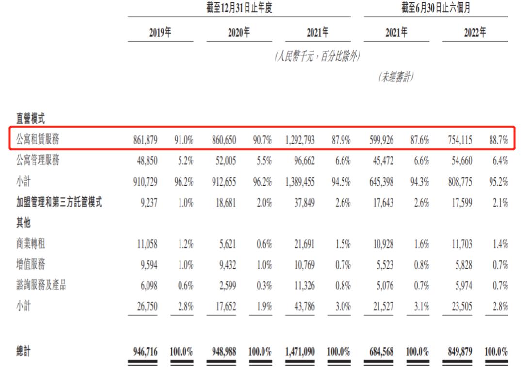 虽然魔方生活服务近几年大力发展第三方托管服务,但目前其收入中仍是直营公寓的租金收入占绝大部分,报告期内直营模式公寓租赁服务的收入分别达到了8.62亿元、8.61亿元、12.93亿元及7.54亿元,占比分别达到91%、90.7%、87.9%及88.7%。