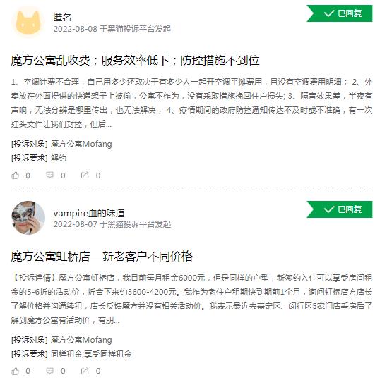 此外,在知乎、黑猫投诉等平台均可以看见魔方生活服务前/现租户对其房租较高、服务态度差、房况不佳、水电费较高且收费不透明等问题的投诉及反馈。