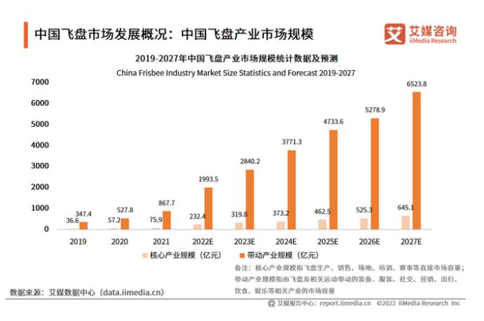 另一方面从行业上看,2021年,中国飞盘产业核心市场规模为75.9亿元,带动产业市场规模为867.7亿元。预计未来六年中国飞盘核心产业规模和带动产业规模持续增长且增长速度加快。