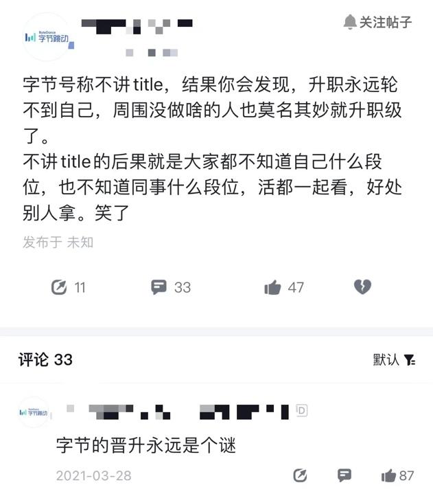 职级既然隐藏,那么晋升肯定也得隐藏,所以晋升都是黑盒的。例如,阿里本身是一个非常“江湖化”的企业,原先就有很多员工质疑其内部晋升机制,现在在评价机制不清楚的情况下,加载保密职级,晋升更加处于黑箱当中,难免会引人不快。字节也同样如此,不讲title的结果就是晋升全靠Leader。