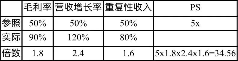 具体来看,美国的SaaS市场更早也更完善,相应估值体系更成熟。此前就有投资人分享过一个经历salesforce、Zoom等大量数据样本验证过的估值体系,行业认为SaaS估值大多遵循“三个50%对应5倍PS”的方法,即毛利50%,增长50%,以及重复性收入占比50%的情况下,下一年度的估值将会给出5倍的PS,例如: