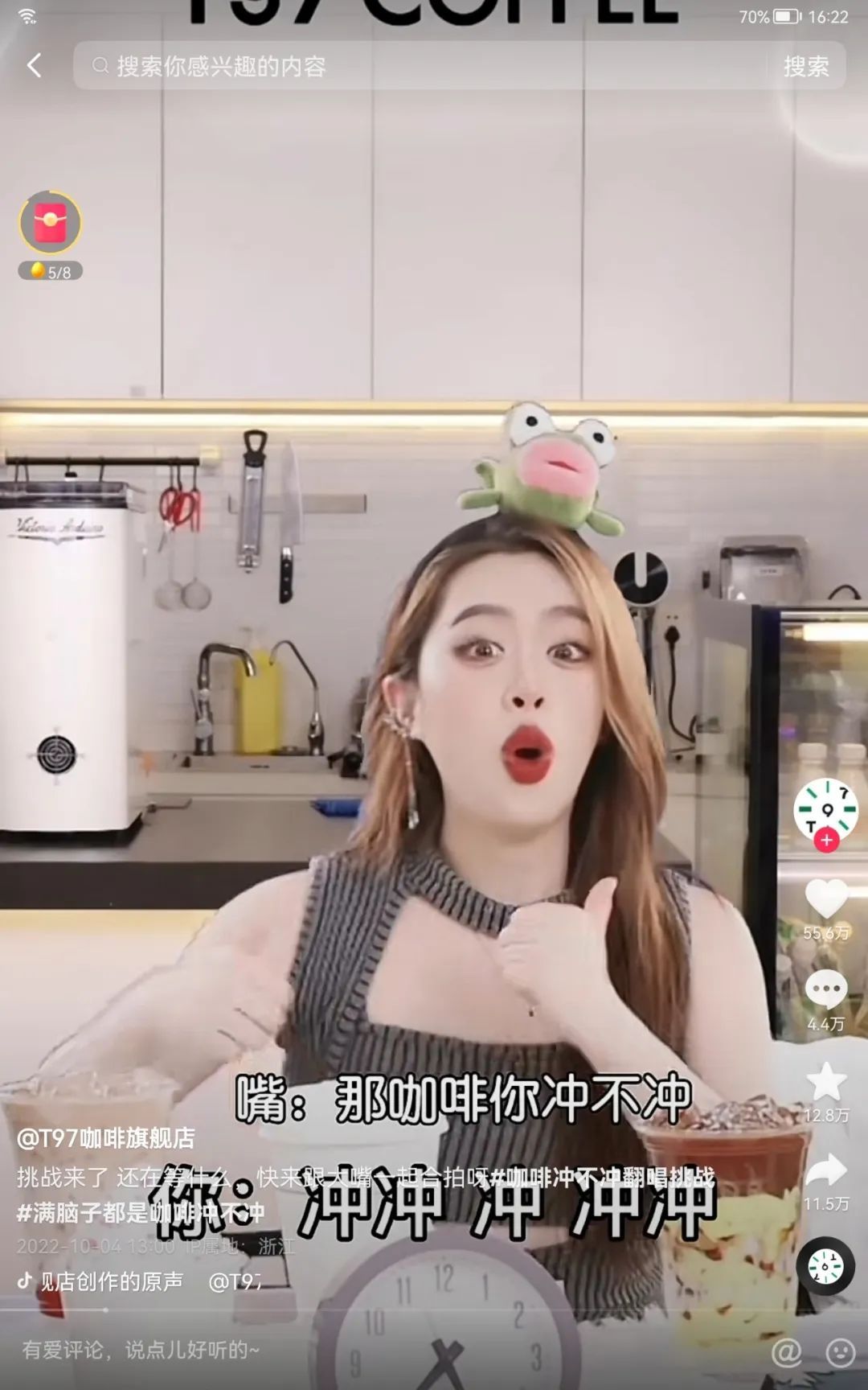 “咖啡你冲不冲,冲冲冲冲冲;福利你冲不冲,冲冲冲冲冲!”只见一位头戴玩偶的女主播在屏幕前,跟随音乐节奏,挥舞双臂、扭动身体,最引人注目的就是她那一张又红又厚的大嘴,再说上一段魔性的喊麦,视觉听觉双重冲击,非常洗脑……