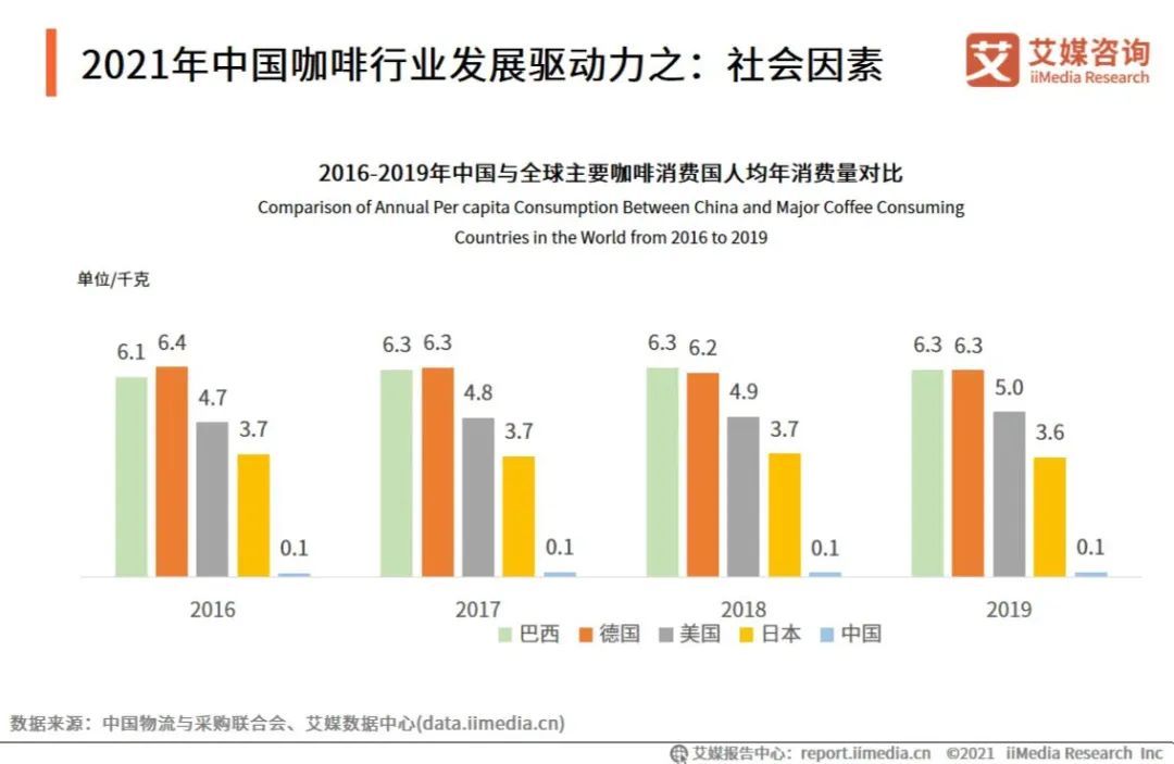 根据艾媒咨询发布的《2016—2019年中国与全球主要咖啡消费国人均消费量》显示,2016至2019年,德国咖啡人均年消费量保持在6.2~6.4千克之间;美国在4.7~5.0千克之间;同为亚洲地区的日本保持在3.7千克左右;而中国咖啡人均年消费量仅为0.1千克,且连续四年都处于最低位。这也从侧面体现了,中国咖啡市场潜力巨大,能承载更多的入局者,目前中国的咖啡销量整体偏低,主要还集中在一二线大城市,若能打开三四线市场,咖啡销量将得到很大提升。
