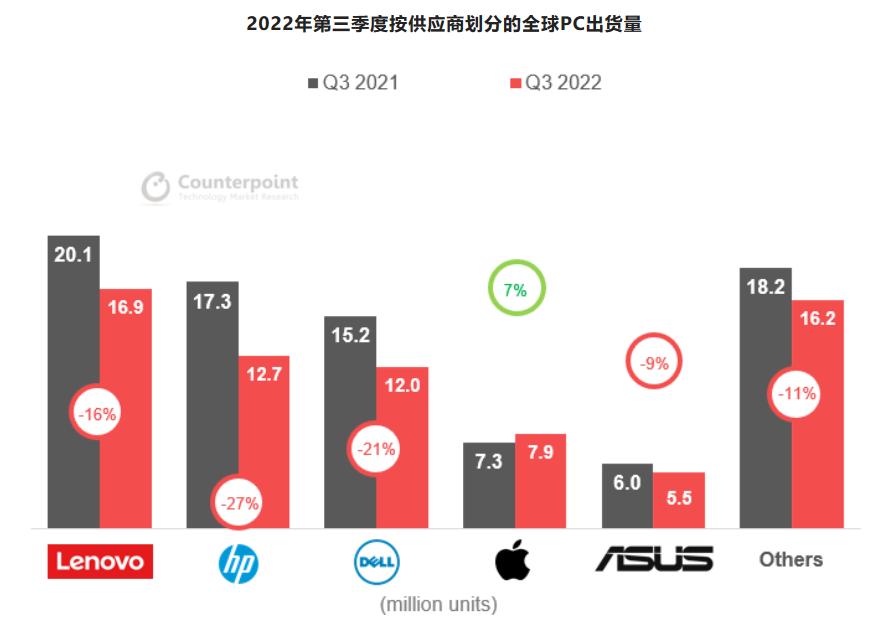 几乎所有PC厂商的出货量都在下滑。其中,排名第一的联想同比下滑16%,惠普同比下滑27%,戴尔同比下滑21%,华硕同比下降9%。受益于新产品推出等因素,苹果逆势增长7%。