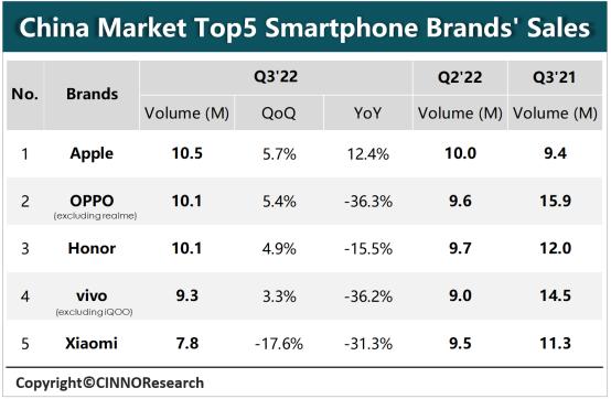 根据Canalys数据,2022年三季度,国内排名第一的vivo出货1410万台,同比下滑23%;OPPO(包括OnePlus)出货1210万台,同比下滑27%;荣耀跌至市场第三,出货1200万台,同比下滑16%;苹果位居第四;小米出货900万台排名第五,同比下滑17%。