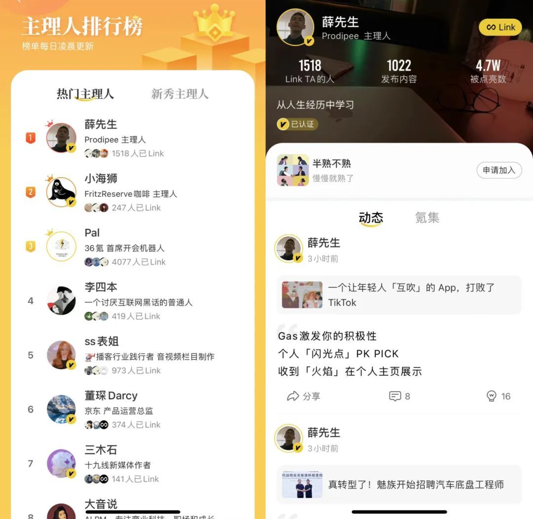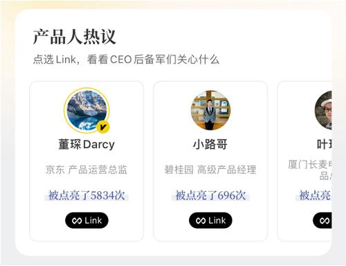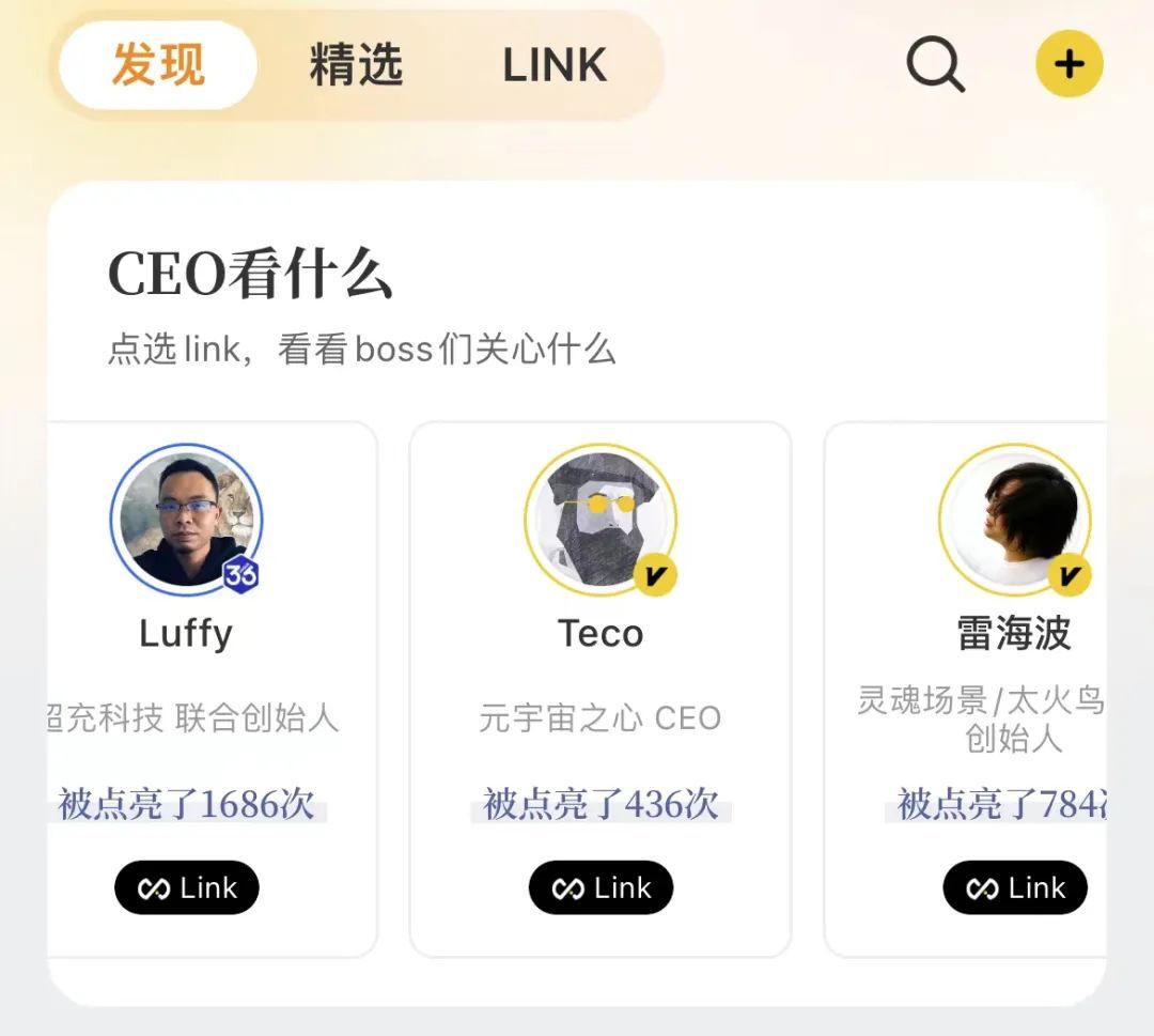 主理人需要填写行业、职位等信息进行申请,成为主理人后每天可以发布1-5条包含图文或视频链接的内容。用户可以通过“Link”主理人,获取自己感兴趣的内容和话题。