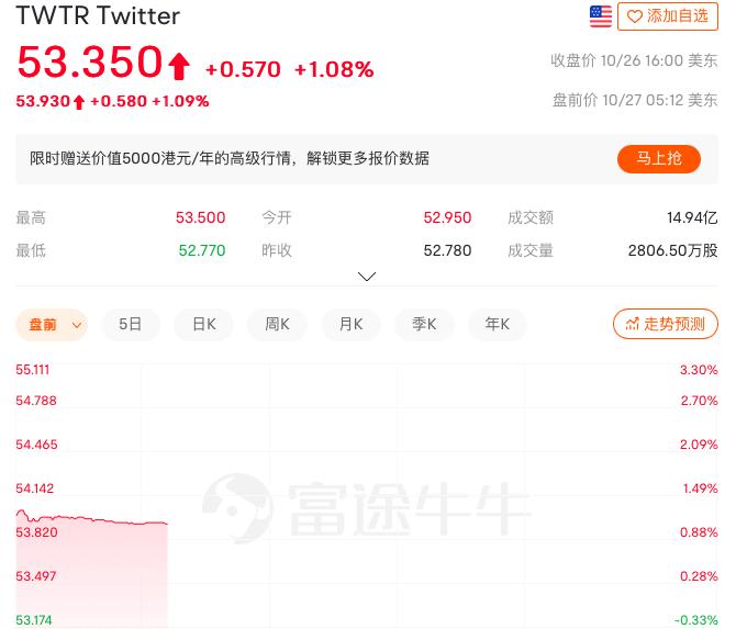 受相关消息刺激,推特股价应声上涨。盘前价格已涨到53.93美元/股,接近于马斯克最初的收购报价(54.20美元)。