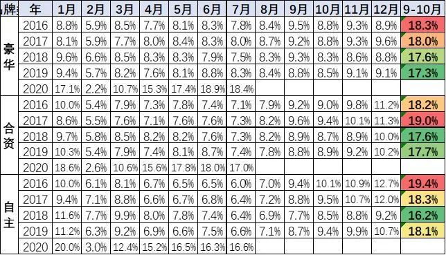 正如我们前文所提到的那样,近年来,车市“金九银十”弱化的趋势愈发明显。从乘联会20年公布的数据可以看出,无论是合资、自主还是豪华车型,9-10月份零售量在全年占比呈现总体下降的状态。从最近21、22年的市场行情来看,这样的现象并没有改善。