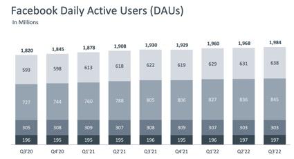 用户数的增长是第三季度为数不多的亮点。日活跃用户和月活跃用户分别上涨了3%和2%,达到历史新高。由于活跃用户超预期,Meta盘后一度涨了8%。
