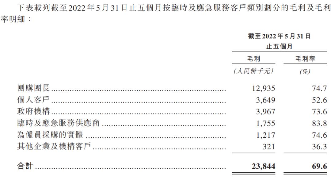 值得一提的是,招股书还指出,临时及应急服务客户的毛利率相对较高,截至 2022年5月31日止五个月约为 69.6%。