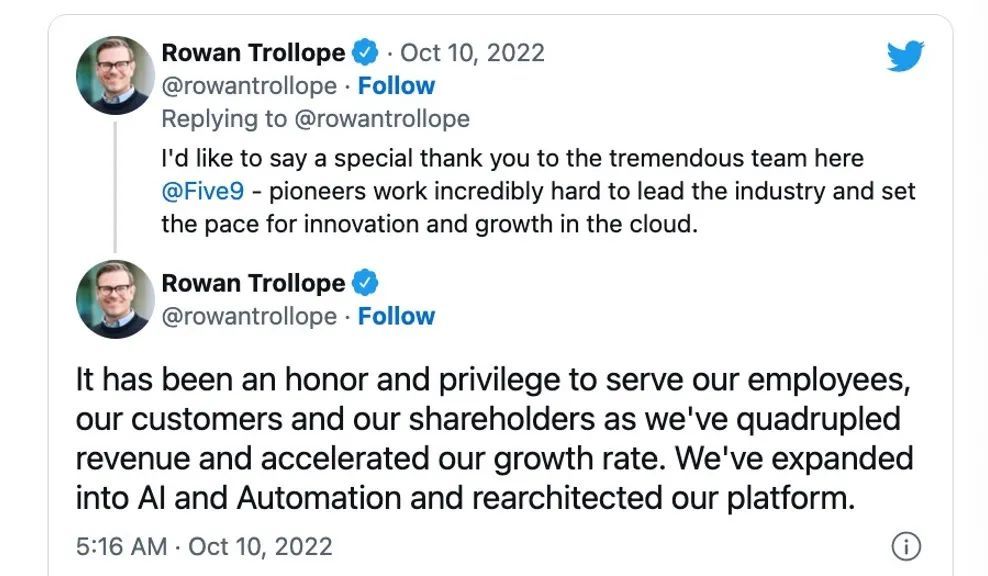 上周,云软件上市公司Five9的CEO Rowan Trollope宣布辞职,导致当天Five9股价暴跌 25%。作为一个在疫情中表现抢眼的通讯服务商,Zoom曾在2021年年中向Five9抛出了以价值147亿美元的全股票的收购意向,但当时的Five9正在高涨的上升势头中,觉得这个价格太低最后拒绝了Zoom。