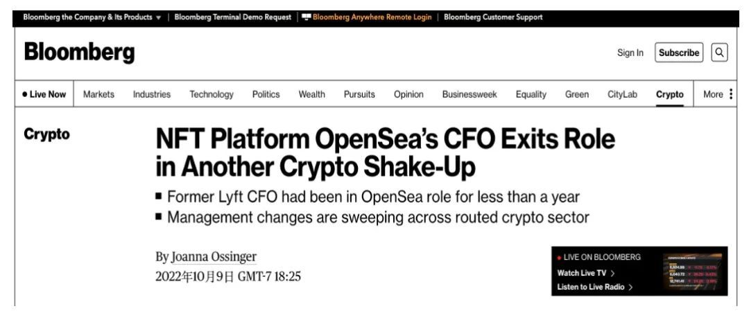 本月初,全球最大的综合NFT交易平台OpenSea 的首席财务官 Brian Roberts宣布离职,而距离他去年年底宣布上任才仅过去了10个月。此前,Brian Roberts曾在Lyft担任了七年的首席财务官,并一手帮助Lyft完成了各轮融资和上市。