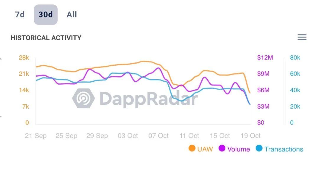 今年以来,Opensea业务层面严重缩水。根据NFT市场研究公司DappRadar的统计数据,在过去30天时间里,OpenSea平台的交易金额只有约2.5亿美元,和去年12月的25亿美元交易额相比下降九成;第三季度其 NFT 销售总额为 34 亿美元,而今年一季度总额为125亿美元。