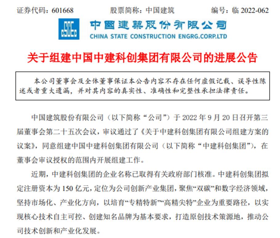 公告称,中国建筑股份有限公司(以下简称“公司”)于2022年9月20日召开第三届董事会第二十五次会议,审议通过了《关于中建科创集团有限公司组建方案的议案》,同意组建中国中建科创集团有限公司(以下简称“中建科创集团”),在董事会审议授权的范围内开展组建工作。