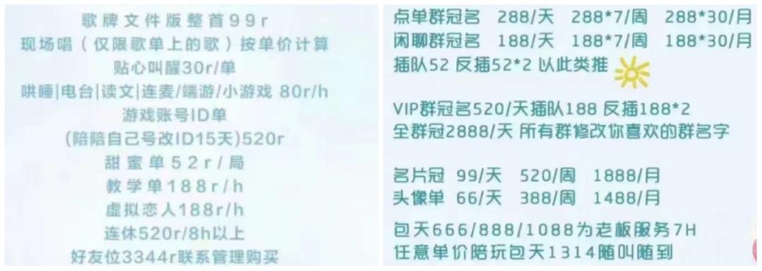 很快,熊猫发来一张服务清单,上面标着俱乐部可以提供的服务项目和价格。项目包含王者荣耀、和平精英、LOL的陪玩服务,歌单、哄睡、电台、连麦、小游戏等陪伴类服务,此外还有头像单、群冠名、虚拟恋人、好友位等附加服务,价格也从20元到3344元不等。