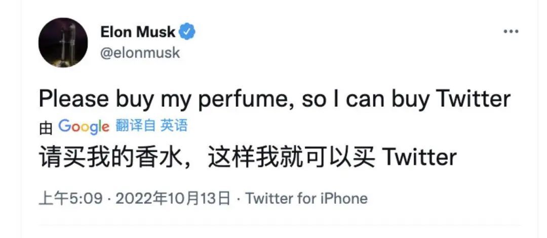 这个收购有多受关注呢?就连收购方马斯克都想借它的热度来做营销。前不久马斯克的无聊公司推出了「世界上最好的香水」,马斯克就发推宣传了这瓶售价 100 美元的烧焦头发味香水,宣传文案就是简单粗暴的「快来买我的香水,这样我就可以买 Twitter。」