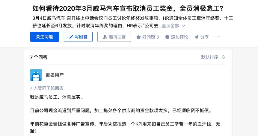 其实这不是威马第一次被爆出降薪的消息,早在2020年3月,就有员工在网络发帖爆料称公司无故取消员工奖金,延迟年终奖发放。