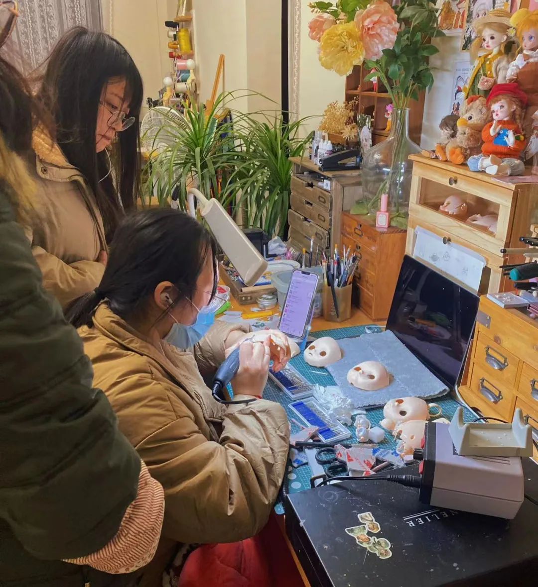 第一眼看到的是排成一排的娃娃裸头,耳边处处响着打磨机雕刻的机器鸣响,改娃师戴着护目镜和口罩,人手一只打磨机,唯有几个已经完工的精致娃娃在欢迎你来到娃圈。