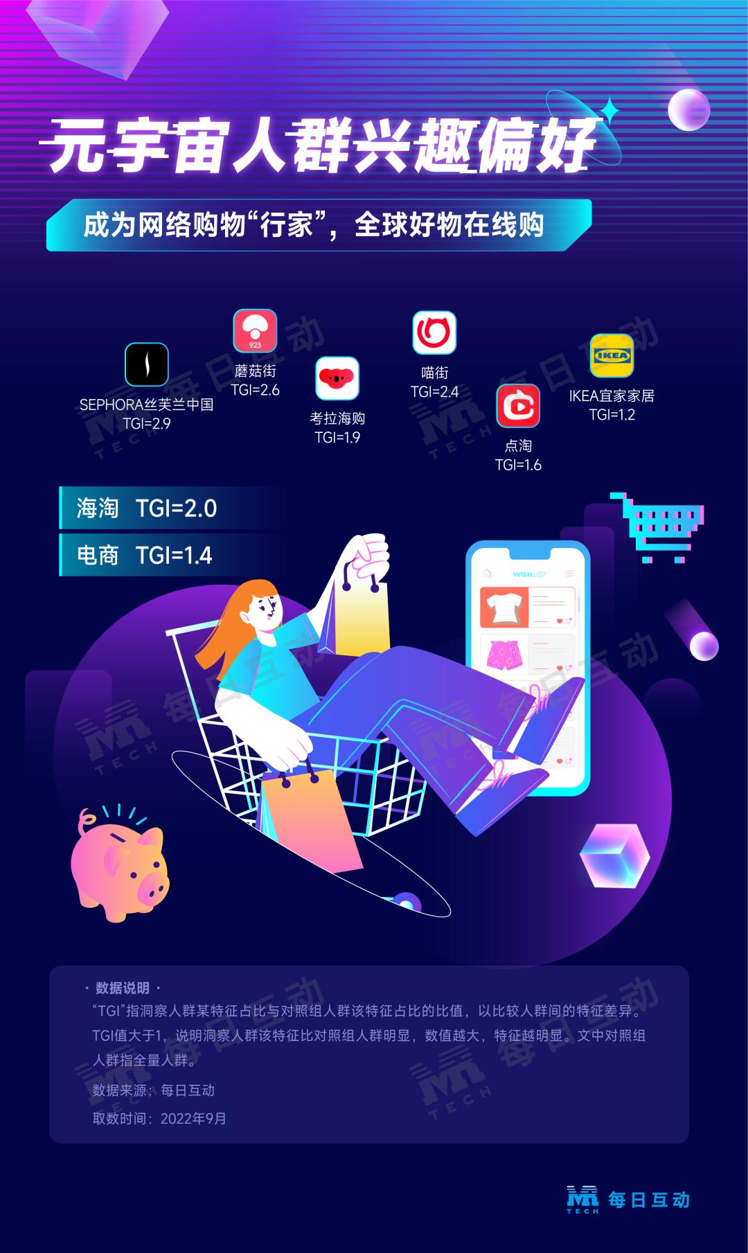 洞察发现,元住民的“海淘”和“电商”兴趣特征明显,偏好值达2.0和1.4。他们对于“丝芙兰”“蘑菇街”“考拉海购”“喵街”“点淘”“宜家家居”等购物类App的偏好度也高于普通人群。事实上,购物类App当前也正积极尝试虚拟人直播、AI试装、云逛街等技术。相信有了元宇宙的加入,未来的在线购物体验将会更加智能,更有科技感,也许在将来我们真得能够像科幻小说里那样,足不出户品味全球美食美酒,远程沉浸式体验全球好物。