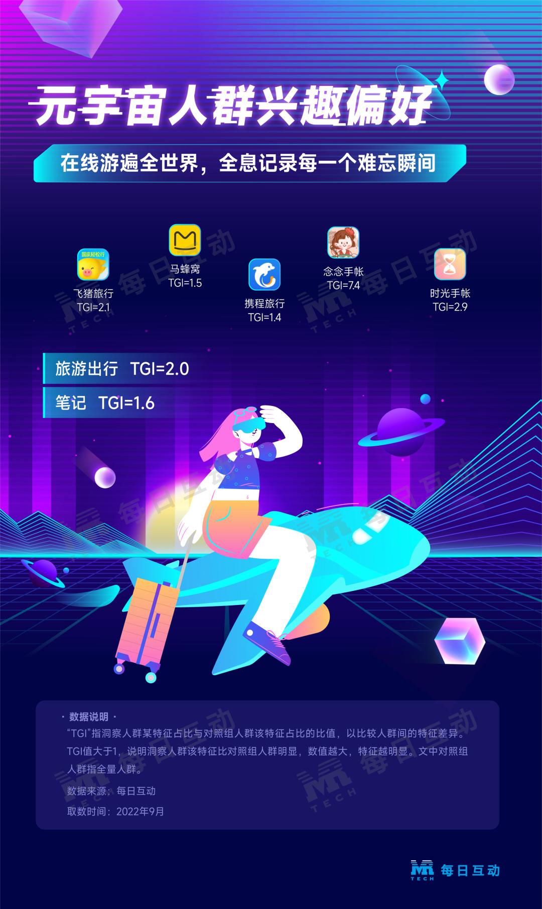 洞察发现,元住民对于“旅游出行”的偏好值达2.0,他们对于写“笔记”的偏好值也有1.6,说明他们是喜欢旅游并且喜欢记录所感所想的一群人。“飞猪旅行”“马蜂窝旅游”“携程旅行”等旅游类的App与元宇宙相结合,可以带着用户在线游遍全世界。“念念手帐”“时光手帐”等记录类的App通过元宇宙可以将每个人的记录变得更加生动,用户每一次翻看笔记都能再次进入记录时刻的所属时空,沉浸式体验生命中的美好与感动。