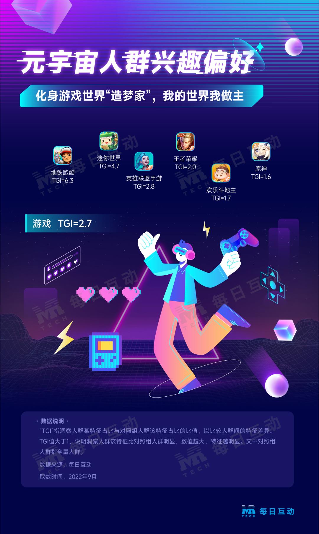 洞察发现,元住民的“游戏”偏好值达2.7,他们对游戏的热爱程度是普通人群的2.7倍。元宇宙本身的虚拟属性与游戏世界不谋而合,目前市面上的元宇宙概念App中游戏类App的比重也不在少数。元住民喜欢的“迷你世界”“英雄联盟”“王者荣耀”“原神”等游戏都拥有完整独立的世界架构,元宇宙的加入可以让玩家们在不同的平行世界穿梭造梦。而以“地铁跑酷”为代表的竞速类游戏和以“欢乐斗地主”为代表的棋牌类游戏如果加入元宇宙的元素则会带来更加身临其境的体验,让快乐加倍。