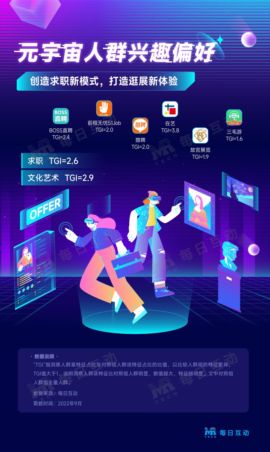 洞察发现,元住民对于“BOSS直聘”“前程无忧”“猎聘”等求职类App偏好明显。若是来一场元宇宙招聘会,对求职者来说就可以更近距离地了解心仪的企业,甚至可以在全球范围内寻找就业机会。元住民对“在艺”“故宫展览”“三毛游”等展会类App偏好也十分明显,显示出他们很喜欢逛展。艺术展览领域与元宇宙的结合,会带给观众们不一样的体验。试想一下倘若你真的能走进清明上河图的世界,能近距离欣赏蒙娜丽莎的微笑,能和戴珍珠耳环的少女交流互动,是不是会对这些艺术藏品有更深的感悟?