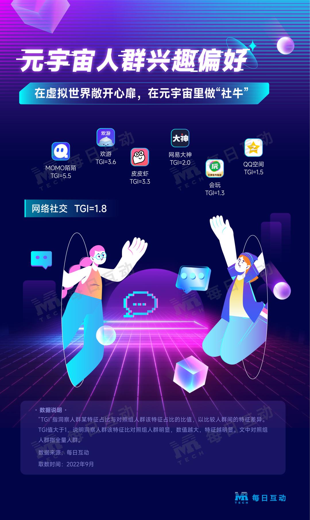 大数据显示,元住民对“网络社交”的偏好度是普通人群的1.8倍,需求强烈。他们对“陌陌”“TT语音”“QQ空间”“会玩”等交友、语音和游戏社交类App偏好明显。网络社交类App本身就有创造个人线上形象的属性,它们用户基础庞大,用户教育十分完善,有了元宇宙的创新理念和技术的加入,整个虚拟世界的架构会更加完整,体验会更加流畅新颖。因此,网络社交也成为了元宇宙最先试水的领域。对元住民来讲,在另一个次元里做一个侃侃而谈的“社牛”,或是做一个有不少粉丝的意见领袖,应该真的很Cool。